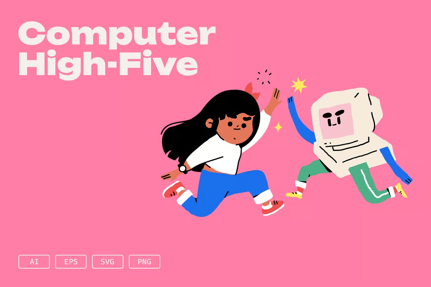 This illustration titled “Computer High-Five” features a cheerful cartoon girl and her vintage computer buddy sharing an energetic high-five. With its bold, playful lines and expressive characters, it’s perfect for tech-themed merch, digital branding, or simply adding a spark of joy to your design projects.