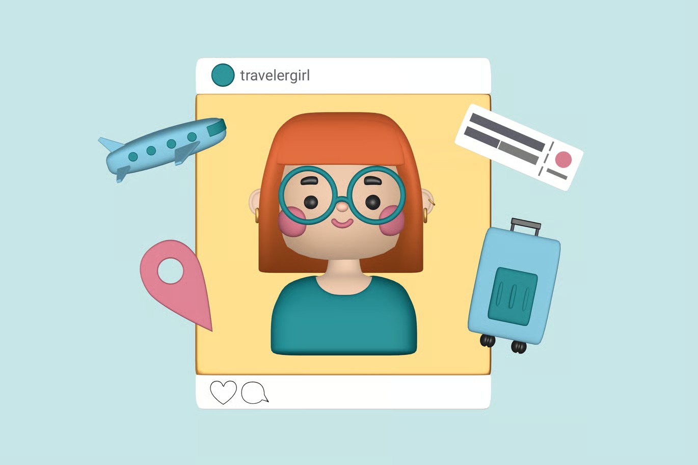 & Free ShippingThis 3D template features a stylized travel blogger character framed within a social media post interface.